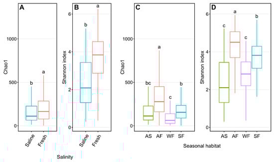 Alpha diversity metrics of Chao1 and Shannon entropy assessments of Arctic char skin community richness and diversity, respectively. Plots show differences between samples obtained from saline water (S; n = 124) and freshwater (F; n = 317) (A,B) and different seasonal habitats (C,D) including samples obtained from autumn saline water (AS; n = 124), autumn fresh water (AF; n = 106), winter fresh water (WF; n = 63), and spring fresh water (SF; n = 148). Different lower-case letters within the graphs display significantly different (p < 0.001) groupings as determined by one-way ANOVA.