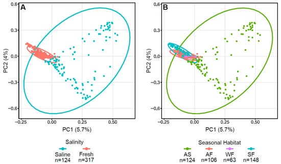 Principal coordinate analysis (PCoA) plots displaying dissimilarities in Arctic char skin samples using Bray–Curtis or beta diversity calculations. PCoA plots with (A) saline and freshwater environments and (B) seasonal habitats of autumn saline water (AS), autumn fresh water (AF), winter fresh water (WF), spring fresh water (SF). Number of fish samples per group (n) are indicated below the graphs.