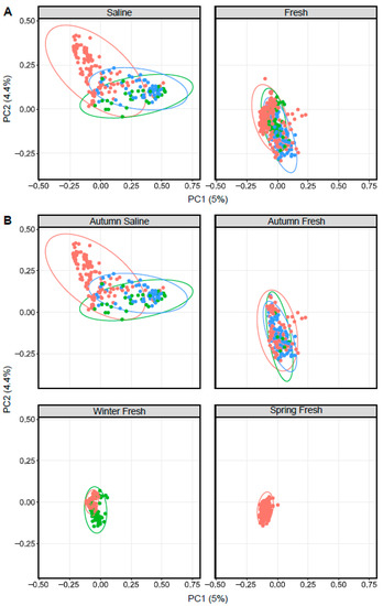 Principal coordinate analysis plots displaying dissimilarity using Bray–Curtis distances between Arctic char (red dots), cisco (bright green) and lake whitefish (blue) in (A) saline and freshwater, as well as (B) different seasonal habitats as indicated above each graph.