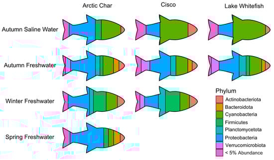 A pictograph showing abundant skin-associated microbiota in the high Arctic salmonids under study and across seasonal gradients. For simplicity, only the most prominent phyla are shown at their average relative abundance in Arctic char, cisco and lake whitefish. Phyla comprising < 5% average relative abundance are grouped together and only those seasonal habitats with sufficient number of caught fish are shown.