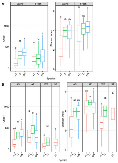 Alpha diversity metrics, Chao1 and Shannon diversity, measuring skin microbial community abundance and diversity, respectively, of Arctic char (AC) and Coregonus species complex cisco (C) as well as lake whitefish (LW) in (A) saline and freshwater and (B) in different seasonal habitats (abbreviated as described in Figure 3 and situated above each graph). Lower case letters within each individual graph display significantly different (p < 0.001) groupings as determined by one-way ANOVA. It should be noted that data from lake whitefish and cisco (Hamilton et al., 2023 [43]) are presented here for comparison with the Arctic char calculated diversity.