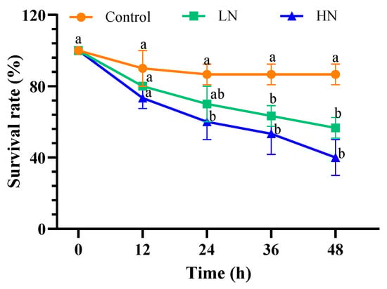 Survival rate in different groups of juvenile P. trituberculatus under nitrite stress. At each time point, the letters indicate significant differences between experimental groups (p < 0.05).