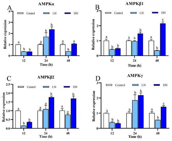 mRNA expression of four genes of AMPK of juvenile P. trituberculatus under nitrite stress. (A) AMPKα, (B) AMPKβ1, (C) AMPKβ2, (D) AMPKγ. At each time point, the letters indicate significant differences between experimental groups (p < 0.05).