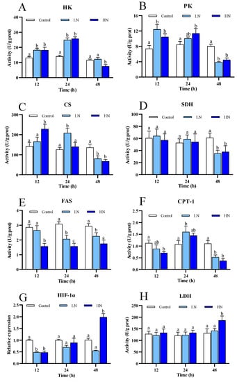 Nitrite stress caused significant changes in the activity of the enzymes involved in glycolysis, Krebs cycle, and lipid metabolism (Figure 3A). HK activity in both the LN and HN groups reached a peak value at 24 h, and the activity in the LN group returned to the control level at 48 h, while the activity in the HN group became lower than the control. The variation of PK activity in the LN and HN groups showed a similar trend (Figure 3B), and both had significantly higher activity at 12 h and 24 h, as well as lower activity at 48 h, compared to the control.