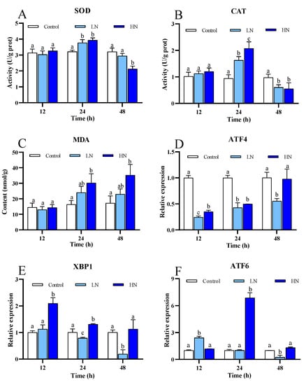 The enzyme activities of two antioxidant enzymes, the content of MDA and mRNA expression of three genes about ER stress of juvenile P. trituberculatus under nitrite stress. (A) The enzymes activities of SOD, (B) the enzyme activities of CAT, (C) the content of MDA, (D) mRNA expression of ATF4, (E) mRNA expression of ATF6, and (F) mRNA expression of XBP1. At each time point, the letters indicate significant differences between experimental groups (p < 0.05).