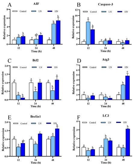 mRNA expression of six genes about apoptosis and autophagy of juvenile P. trituberculatus under nitrite stress. (A) AIF, (B) Caspase-3, (C) Bcl-2, (D) Atg3, (E) Beclin1, and (F) LC3. At each time point, the letters indicate significant differences between experimental groups (p < 0.05).