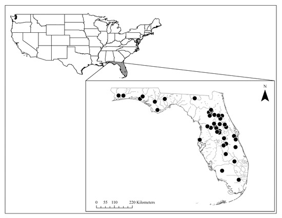 31. Moran, J.; Tuten, T.; Anderson, C.; Dunn, K.; O’Connor, J.; Saxton, J.; Buescher, C.; Miller, K.; Nagid, E.; Ortiz, L.; et al. Range extension of Spotted Bullhead, Ameiurus serracanthus Family Ictaluridae, in Peninsular Florida. Southeast. Nat. 2021, 20, N92–N97. [Google Scholar] [CrossRef]
