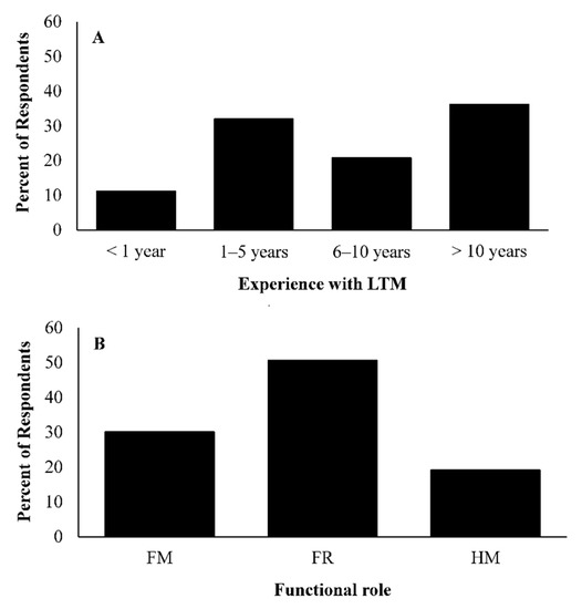 Figure 2. Demographics of respondents to an email survey about Florida’s statewide Freshwater Fisheries Long-Term Monitoring (LTM) program. Panels depict the percentage of respondents based on (A) experience with the LTM program and (B) functional role (fisheries management, FM; fisheries research, FR; and habitat management, HM).