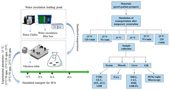 The experimental fish were subjected to simulated transport after 24 h of temporary rearing. The fish were randomly dispersed in 24 double-layered nylon plastic bags (50 cm × 90 cm, 6 fish in each bag, fish to water ratio was 1: 3, 24 shipping boxes). Each nylon bag was filled with approximately one-third seawater (10 L) and two-thirds oxygen. The nylon bag was sealed with a rubber band. We set the following transport conditions: no shaking, transported at 15 °C; shaking at 70 rpm, transported at 15 °C (15 °C/70 rpm); shaking at 120 rpm, transported at 15 °C (15 °C/120 rpm); no shaking, transported at 25 °C; shaking at 70 rpm, transported at 25 °C (25 °C/70 rpm); and shaking at 120 rpm, transported at 25 °C (25 °C/120 rpm). The fish were then placed on a simulated transport table (Changzhou, China) for 48 h. The control and experimental groups were sampled at 0, 12, 24, 36, and 48 h after the simulated transport. Survival of groupers was measured at each sampling point. Figure 1 illustrates the design process of the experiment.
