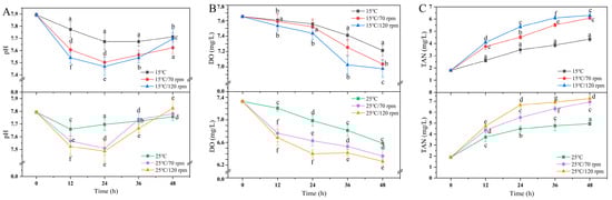 Changes in (A) water pH, (B) DO, and (C) TAN during transport. Values were obtained from average of all samples and given as means ± SD (n = 5). Different letters indicate significant differences among the treatments.