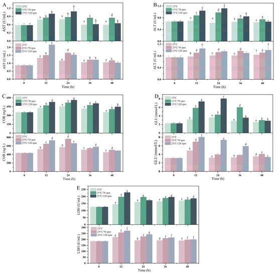 Changes in (A) serum AST, (B) ALT, (C) COR, (D) GLU, and (E) LDH during transport. Values were obtained from average of all samples and given as means ± SD (n = 5). Different letters above the bars indicate significant differences among the treatments.