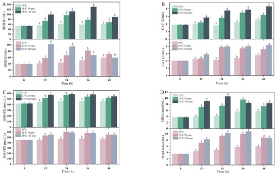 Changes in (A) liver SOD, (B) CAT, (C) GSH-PX, and (D) MDA during transport. Values were obtained from average of all samples and given as means ± SD (n = 5). Different letters above the bars indicate significant differences among the treatments.