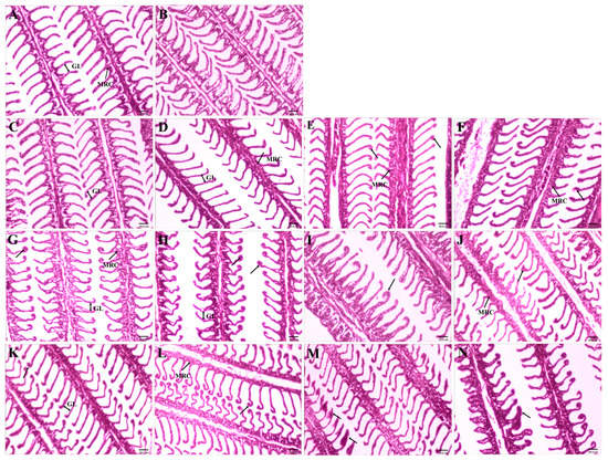 Representative H&E-stained micrographs of the gill structure of the pearl gentian grouper at different transport temperatures and vibration rates. (A) 15 °C, (B) 25 °C, (C) 24 h—5 °C, (D) 24 h—25 °C, (E) 24 h—15 °C/70 rpm, (F) 24 h—25 °C/70 rpm, (G) 24 h—15 °C/120 rpm, (H) 24 h—25 °C/120 rpm, (I) 48 h—15 °C, (J) 48 h—25 °C, (K) 48 h—15 °C/70 rpm, (L) 48 h—25 °C/70 rpm, (M) 48 h—15 °C/120 rpm, and (N) 48 h—25 °C/120 rpm. Bar = 20 μm. Gill lamella (GL), mitochondrial-rich cell (MRC), and epithelial cell swelling (↑).