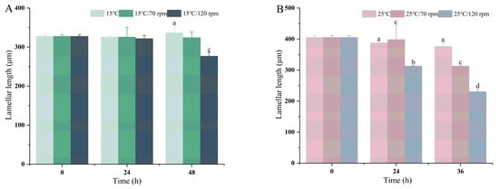 The results of the different transport temperatures and vibration speeds on the gill tissue sections are presented in Figure 5. In the 15 °C and 25 °C controls, the gill lamellae were slender, tightly arranged, evenly distributed, and had normal tissue morphology. The epithelial cells were undamaged. The mitochondria-rich cells were moderately abundant and were mainly concentrated at the bottom of the gill lamellae. The gill lamellae showed different degrees of damage as the transport time increased. The gill lamellae of the control group were slightly bent, and the structure had no obvious change after being transported for 24 h. Compared to the control group, the gill lamellae in both the lower- and higher-temperature transport groups began to fold. The epithelial cells became swollen, and the distance between the gill lamellae shortened. In the higher-frequency groups (15 °C/120 rpm and 25 °C/120 rpm), the gill lamellae were severely bent, and the apical area was bulbous and thickened. The erythrocytes were unevenly distributed and spread towards the top of the gill lamellae, with no significant changes at the bottom. After 48 h of transport, almost all gill lamellae showed varying degrees of curvature, thickening, and swelling of the epithelial cells. During transport, the majority of the gill lamellae were thickened and curved, rod or S-shaped, with increased mucus cells, and a small number of epithelial cells in the gill lamellae were disrupted and lost. In addition, the length of the lamellae of the pearl gentian grouper was measured (Figure 6). As water temperature and speed increased, the gill lamella length of grouper gills in the treatment group became progressively shorter.