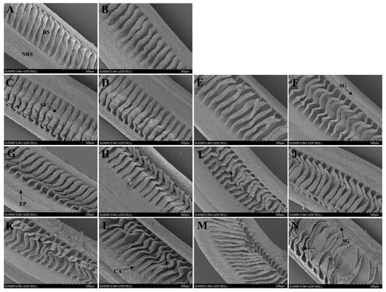 Representative SEM micrographs showing changes in gill structure after different temperatures and vibration rates. (A) 15 °C, (B) 25 °C, (C) 24 h—15 °C, (D) 24 h—25 °C, I 24 h—15 °C/70 rpm, (F) 24 h—25 °C/70 rpm, (G) 24 h—15 °C/120 rpm, (H) 24 h—25 °C/120 rpm, (I) 48 h—15 °C, (J) 48 h—25 °C, (K) 48 h—15 °C/70 rpm, (L) 48 h—25 °C/—70 rpm, (M) 48 h—15 °C/120 rpm, and (N) 48 h—25 °C/120 rpm. Bar = 200 μm. Non-respiratory surface (NRS), respiratory surface (RS), gill lamellae (GL), secretory granules (SG), epithelial cells (EP), cavities (CA), and disorganized gill lamellae (↑).