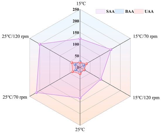 The effects of different transport temperatures and vibration speeds on the FAA parameters are shown in Table 3. A total of 14 FAAs were detected in the grouper. The main FAAs in fresh groupers were glycine (Gly) and lysine (Lys). The total free amino acid (TFAA) content of most samples was significantly different during transport. Most of the transport groups showed a decreasing trend in TFAA after 48 h of transport. In contrast, the TFAA content increased by 40.27% and 31.74% in the 25 °C/70 rpm and 25 °C/120 rpm groups, respectively, compared to the control group. Figure 8 shows the effects of 48 h of transportation on sweet amino acids (SAA), bitter amino acids (BAA), and umami amino acids (UAA) in grouper muscle. UAA increased by 36.75% and 49.19% in the 25 °C/70 rpm and 25 °C/120 rpm groups, respectively. SAA increased by 68.60% and 51.04%, respectively.