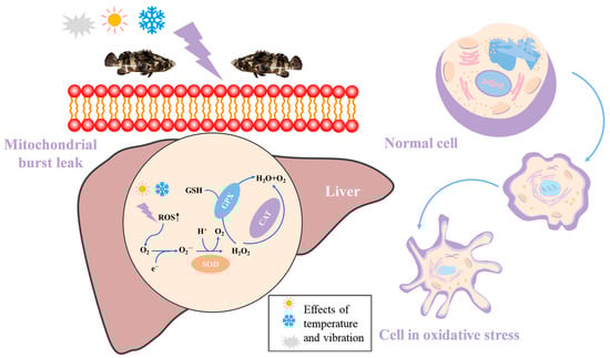 The antioxidant system of the fish organism is in a dynamic equilibrium under normal conditions. When fish are stressed, the organism produces large amounts of reactive oxygen radicals (ROS), and the production of ROS may alter the activity of antioxidant enzymes []. Among them, SOD, CAT, and GSH-PX are essential antioxidant enzymes in biological systems. SOD converts harmful superoxide anions into hydrogen peroxide and oxygen, followed by enzymes such as CAT working in concert to convert hydrogen peroxide into oxygen and harmless water []. GSH-PX has a protective effect on biofilms. In this experiment, liver SOD, CAT, and GSH-PX were significantly increased compared with the control group, and the enzyme activities almost increased first and then decreased. The elevated SOD activity indicated that the groupers experienced a severe stress response during transportation, resulting in the generation of a large number of free radicals in the body []. In order to maintain the stability of the body, the activity of SOD increases rapidly to eliminate excess ROS. The decrease in enzyme activity may be due to the irreversible damage to the body’s antioxidant system caused by excessive free radicals. The increase in antioxidant enzyme activity is thought to be a physiological response to the elimination of ROS (Figure 9). GSH-PX and CAT are involved in the removal of hydrogen peroxide []. In the pre-transport stage, the enzyme activity of the high-speed treatment group was lower than that of the high-speed treatment group. It can be seen that strong vibrations lead to stronger oxidative stress in the fish. At low speeds, groupers can maintain the balance of the body’s antioxidant system by repairing weak damage by itself, which is more suitable for the water transportation process of grouper. MDA is a product of lipid peroxidation, and its level can reflect the degree of oxidative damage to the body []. In this study, MDA levels increased sharply with increasing simulated transmission time and vibration frequency. This shows that high-speed vibration causes severe oxidative stress in fish, generates a large number of free radicals, induces lipid peroxidation, accelerates metabolism in the body, and leads to excessive accumulation of metabolites [].