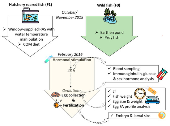 Graphical abstract showing the design of the study, starting from pre-spawn wintering of wild (F0) and hatchery-reared (F1) fish; COM = commercial diet, LT = oocyte latency time, FA = fatty acid. Designed using images from Flaticon.com, https://www.flaticom.com.