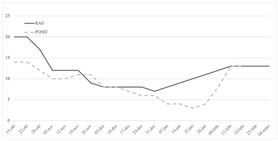 Weekly water temperature manipulation conducted from mid-October 2015 in a recirculation facility (RAS) where F1 broodstock was maintained and temperature measured in the outdoor wild F0 broodstock POND until hormonal stimulation and ovulation in early March of 2016, while both groups were under the natural photothermal regime. On 11 February 2016, wild pike-perch breeders were stocked in one separate identical tank in the recirculation system.