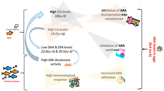 An illustration of the above-provided assumptions on the effects of FA composition of the diets, as well as intrinsic factors, on ARA levels in eggs is given in Figure 3.