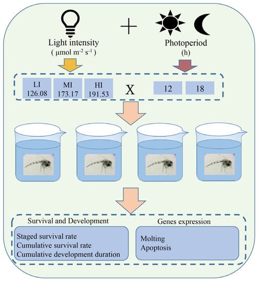 Our previous work has studied the optimal light intensity (124.31–195.31 μmol m−2 s−1) [6] and photoperiod (12–18 h photophase) (unpublished data) for P. trituberculatus larvae. This study aims to further investigate the interaction of light intensity and photoperiod on P. trituberculatus by examining the survival, development, molting, and apoptosis-related genes. The results could help define the suitable lighting protocol for a P. trituberculatus nursery.