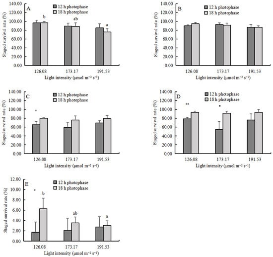 The staged survival rate (SSR, mean ± SD, n = 4) of larvae: (A) zoea I, (B) zoea II, (C) zoea III, (D) zoea IV, and (E) megalopa. Different lowercase letters indicate significant differences among different light intensities at the same photophase treatment (p < 0.05). Asterisks denote significant differences between photoperiods at the same light intensity treatment (*, p < 0.05; **, p < 0.01).