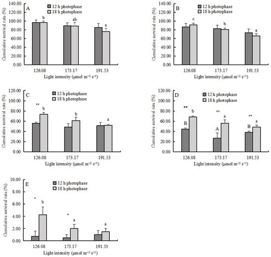 The cumulative survival rate (CSR, mean ± SD, n = 4) of larvae: (A) zoea I, (B) zoea II, (C) zoea III, (D) zoea IV, and (E) megalopa. Different capital letters and lowercase letters indicate significant differences among different light intensities at the same photophase treatment (p < 0.05). Asterisks denote significant differences between photoperiods at the same light intensity (*, p < 0.05; **, p < 0.01).