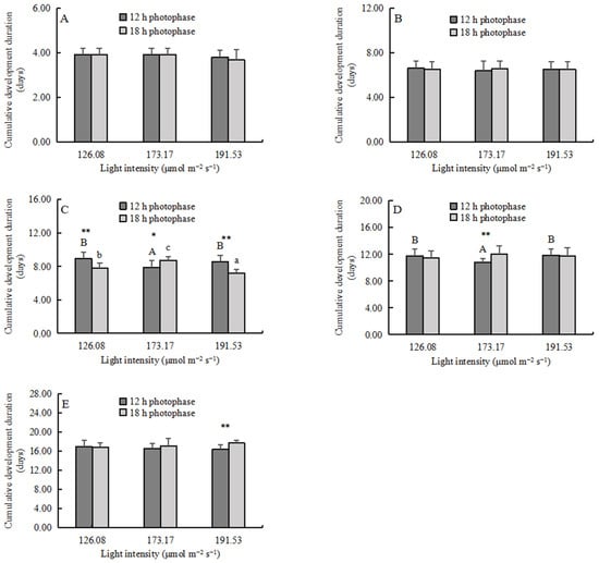 The cumulative development duration (CDD, mean ± SD, n = 4) of larvae: (A) zoea I, (B) zoea II, (C) zoea III, (D) zoea IV, and (E) megalopa. Different capital letters and lowercase letters indicate significant differences among different light intensities at the same photophase treatment (p < 0.05). Asterisks denote significant differences between photoperiods at the same light intensity (*, p < 0.05; **, p < 0.01).