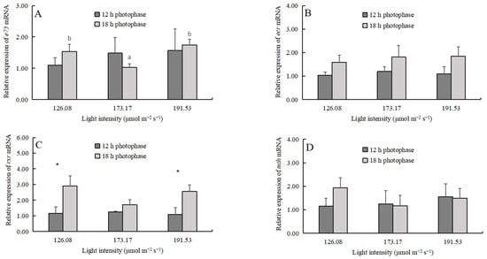 The apoptosis-related gene expression (mean ± SD, n = 4) of juvenile crabs: (A) e75, (B) ecr, (C) rxr, and (D) mih. Different lowercase letters indicate significant difference among different light intensities at the same photophase treatment (p < 0.05). Asterisks denote significant differences between photoperiods at the same light intensity (*, p < 0.05).