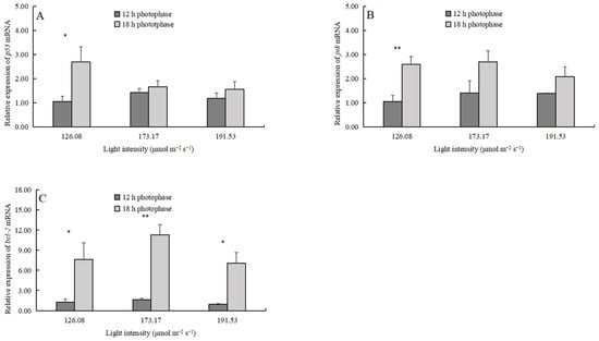 The apoptosis-related gene expression (mean ± SD, n = 4) of juvenile crabs: (A) p53, (B) jnk, and (C) bcl-2. Asterisks denote significant differences between photoperiods at the same light intensity (*, p < 0.05; **, p < 0.01).