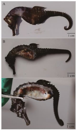 - Declercq, A.M.; Chiers, K.; Broeck, W.V.; Rekecki, A.; Teerlinck, S.; Adriaens, D.; Haesebrouck, F.; Decosere, A. White necrotic tail tips in estuary seahorses, Hippocampus kuda, Bleeker. J. Fish Dis. 2014, 37, 501–504. [Google Scholar] [CrossRef]