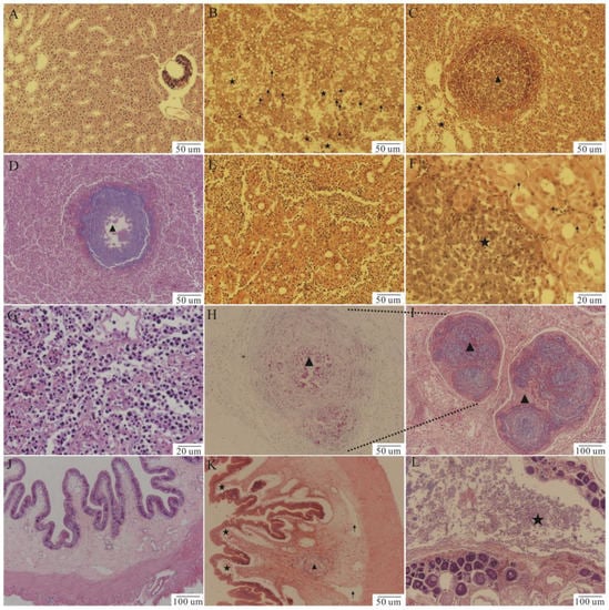 ). (K) Intestine, showing the mucosal layer and the muscle layer were separated (→), the intestinal villi and intestinal mucosal tissue rotted and falling off (★), and small granuloma (