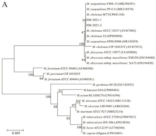 | Tests | Mycobacterium chelonae | Mycobacterium marinum Strain myco001 | Mycobacterium ulcerans Strain BS123 | HM-2021-1 | HM-2021-2 |