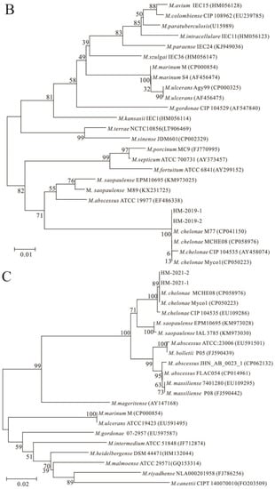 2.3.2. 16S rDNA, Hsp65, and RpoB Sequences and Phylogenetic Analysis