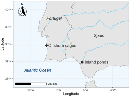 Two different sea bass farming facilities were selected for this study (Figure 1). The first one was located in the Guadalquivir River estuary, with brackish water, in Seville, Spain. This farm system was based on rectangular inland ponds, with a surface area of 2.700 m2 and a volume of 3150 m3. The second farming facility was in the Atlantic Ocean, in the Setúbal district, Portugal. This farm consisted of cylindrical offshore cages, of an approximate volume of 6.500 m3. In both cases, the fish farm managers set the seeding and management of the facilities aiming at obtaining a density of around 5 fish/m3. Moreover, fish were fed until they were satiated during the whole breeding process. Samples were obtained seasonally for one year. About 200 sea bass were measured for each sampling. Fish were measured in the field for standard length (SL) to the nearest millimeter, and weighed (W, wet weight) to the nearest gram. All the specimens were measured during the harvest process before sales, with all of them being approximately the same age. Daily records of temperature and salinity were provided by the managers of the facilities, except for offshore salinity due to its low variation. Previous studies monitoring water quality in the study area where the offshore facilities were located reported average salinity values of 36 PSU, with little inter- and intra-annual variability [,]. Thus, we considered this parameter as constant.