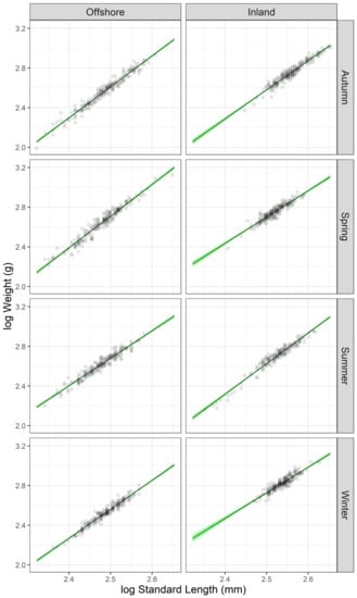 Significant differences were found in the intercept and slope among seasons for the inland (ANCOVA, F12.791; p < 0.001) and offshore (ANCOVA, F13.414; p < 0.001) facilities.