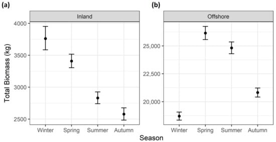 Assuming that temperature and salinity variations are responsible for the observed differences in the length–weight relationship of fish among different facilities and seasons, it is crucial to account for such variations when estimating biomass based on length. In this regard, the practical case presented in Figure 3 shows the variations in the estimated biomass for a cultivation unit in the two kinds of studied facilities. The data reveal significant differences, with variations reaching up to 31.5% between winter and autumn in inland ponds, and 28.5% in offshore cages between winter and spring, which are the seasons that exhibit the greatest differences, respectively. These substantial differences should be taken into consideration when estimating fish biomass. Increasingly precise methods are being developed to remotely estimate the length of fish, and the same precision should be the goal for the length–weight conversion, as the total biomass is the estimated value that really matters to fish farmers for the management of their companies.