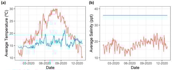 Daily temperature (a) and salinity (b) variation in the two studied locations: inland ponds (red lines) and offshore cages (blue lines).