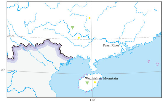 - Zhu, H. Biogeographical Evidences Help Revealing the Origin of Hainan Island. PLoS ONE 2016, 11, e0151941. [Google Scholar] [CrossRef] [PubMed]
