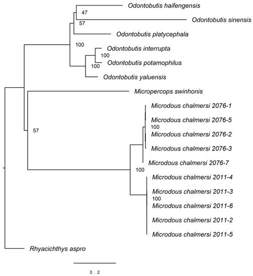 Li et al. (2018) found that M. chalmersi has a synapomorphy of the Odontobutidae, that is, scapula well-developed separating the upper proximal radials of the pectoral fin and the cleithrum [5]. They also reconstructed a phylogenetic tree of the Odontobutidae based on 4434 nuclear gene loci showing that M. chalmersi had a close relationship with the genera Micropercops and Sineleotris. Due to the genetic distance of M. chalmersi to Sineleotris being more divergent than that of Micropercops to Sineleotris, Microdous was proposed as an independent genus instead of being a species of Sineleotris. In their results, the two samples of M. chalmersi from Guangxi were grouped together and then joined to an individual from Hainan with a large distance.