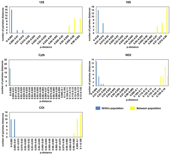 The genetic distance between samples from the two disjunct populations based on the 12S gene ranged from 0.052 to 0.06, whereas the genetic distance between samples within each location ranged from 0 to 0.011 (Supplementary Materials Table S3). The genetic distance for 16S gene was 0.068–0.078 between populations, and 0–0.013 within populations. The number for the COI gene was 0.095–0.102 between populations and 0–0.009 within populations; for the Cytb gene, it was 0.131–0.134 between populations and 0–0.004 within populations; for the ND2 gene, it was 0.146–0.163 between populations and 0–0.018 within populations (Supplementary Materials Table S3). The results of these genes showed that genetic distance between samples from Guangxi and Hainan was much greater than the genetic distance between different individuals in the same location and there was no overlap between the within-population and between-population genetic distances (Figure 4).