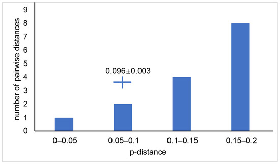 The genetic distance between Odontobutis species ranged from 0.028 to 0.128 for 12S, 0.026 to 0.171 for 16S, 0.05 to 0.257 for Cytb, 0.062 to 0.27 for ND2, and 0.041 to 0.175 for COI (Supplementary Materials Table S4). For a comparison, the genetic distance between individuals of M. chalmersi from Guangxi and Hainan ranged from 0.095 to 0.102 for COI, with a mean of 0.096 and a standard deviation of 0.003 (Figure 5).