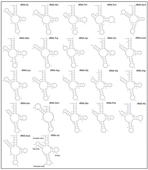 - Watanabe, Y.; Suematsu, T.; Ohtsuki, T. Losing the stem-loop structure from metazoan mitochondrial tRNAs and co-evolution of interacting factors. Front. Genet. 2014, 5, 109. [Google Scholar] [CrossRef] [PubMed]