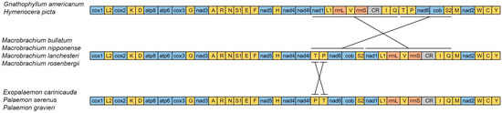 - Shen, X.; Sun, M.; Wu, Z.; Tian, M.; Cheng, H.; Zhao, F.; Meng, X. The complete mitochondrial genome of the ridgetail white prawn Exopalaemon carinicauda Holthuis, 1950 (Crustacean: Decapoda: Palaemonidae) revealed a novel rearrangement of tRNA genes. Gene 2009, 437, 1–8. [Google Scholar] [CrossRef] [PubMed]