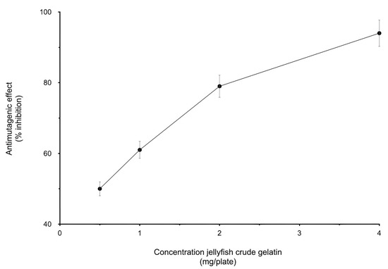 Concerning the antimutagenic activity, the jellyfish crude gelatin sample showed the capacity to inhibit mutation induced by AFB1 in the S. enterica Typhimurium TA100 strain (Figure 1). The percentage of inhibition was greater than 50% when 0.5 mg/plate was tested, representing moderate inhibition [42], whereas with 4.0 mg/plate, the inhibition was greater than 60%, representing strong inhibition [42]. A similar antimutagenic activity (40–50%) was derived when 0.5 mg/plate of ethanolic extracts from salmon (Oncorhynchus masou) was tested [43], but this activity was higher than that of the protein hydrolysate derived from giant squid skin, which showed 50% inhibition when 5 mg/plate was evaluated [44].