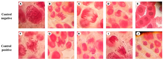 Phases of normal and abnormal mitoses exposed to water and sodium azide. Chromosomal aberrations observed in Allium cepa root tip cells: (A) normal prophase; (B) normal metaphase; (C) normal anaphase; (D) normal late anaphase; (E) normal telophase; (F) abnormal metaphase; (G) abnormal metaphase; (H) abnormal anaphase with lagging; (I) abnormal anaphase with lag; and (J) abnormal telophase.