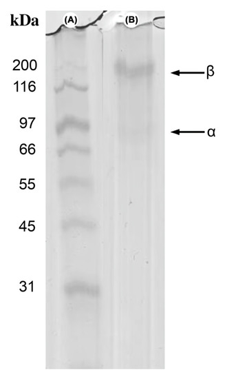 SDS–polyacrylamide protein pattern of the jellyfish (Stomolophus meleagris) crude gelatin sample. (A): molecular weight marker; (B): jellyfish crude gelatin sample.