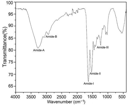 The FT-IR spectrum of the jellyfish crude gelatin sample was recorded (PerkinElmer FT-IR/FIT spectrometer, Waltham, MA, USA) from 4000 to 500 cm−1 with a resolution of 4 cm−1. The crude gelatin sample (1 mg) was mixed with dry potassium bromide (100 mg, KBr) pellet [29].
