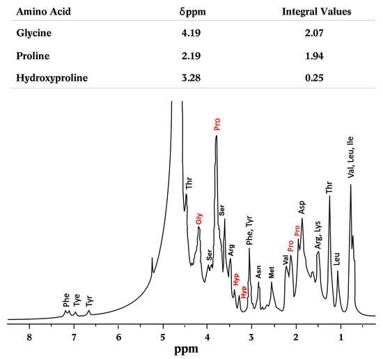 1H-NMR spectra of the jellyfish crude gelatin sample. Amino acids are indicated by their corresponding peaks.