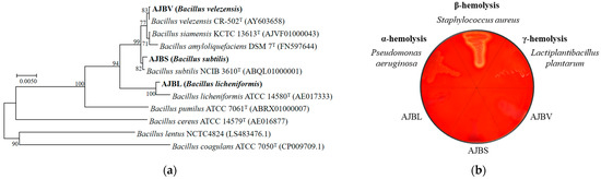 Phylogenetic tree and hemolytic activity analysis of the isolated strains. (a) The phylogenetic tree was constructed by the neighbor-joining method using Molecular Evolutionary Genetics Analysis version 7 (MEGA7) with 1000 bootstrap repetitions, after which the 16S rRNA sequences were aligned by the Clustal W program. NCBI accession numbers are presented in parentheses. (b) The hemolytic activity was measured using a blood agar plate, and Pseudomonas aeruginosa had α-hemolytic activity, Staphylococcus aureus had β-hemolytic activity, and Lactiplantibacillus plantarum having γ (non)-hemolytic activity were used as controls. AJBV, Bacillus velezensis; AJBS, B. subtilis; AJBL, B. licheniformis.
